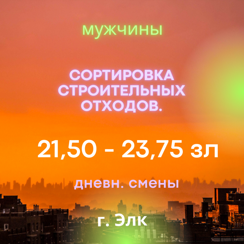 Работа заключается в сортировке и сегрегации строительных отходов на конвейерной ленте, так же выгрузка, сортировка и сегрегация крупных элементов перед подачей на ленту.