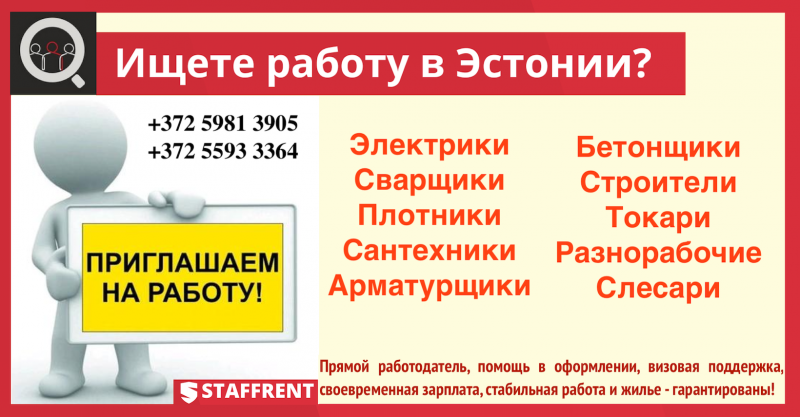 Предлагаем официальное трудоустройство в Эстонии. Объекты по всей Эстонии - производства, склады, дорожные работы. Вакансия бесплатная, не агенство!